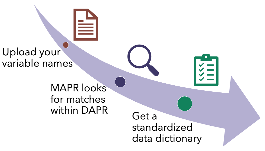 On its first release, it will take the variable names the researcher used, find corresponding matches within the DAPR schema, and provide a data dictionary to map the original names to the DAPR names and associated CDEs in the OMOP CDM.