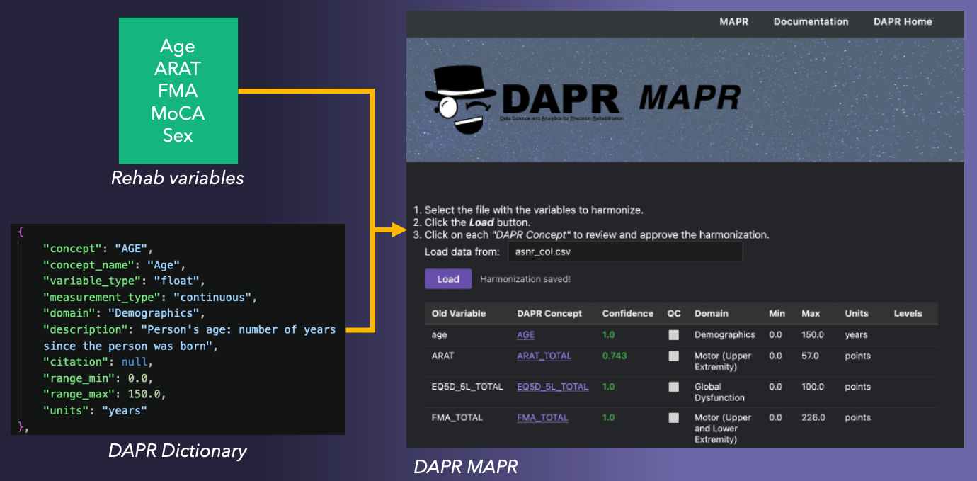 We are calling these the DAPR Schema (the structure for organizing and building our dictionary), DAPR Dictionary (a curated collection of rehabilitation-relevant variables), DAPR Thesaurus (a cross-reference map between some existing CDMs), and DAPR MAPR (our mapping application).