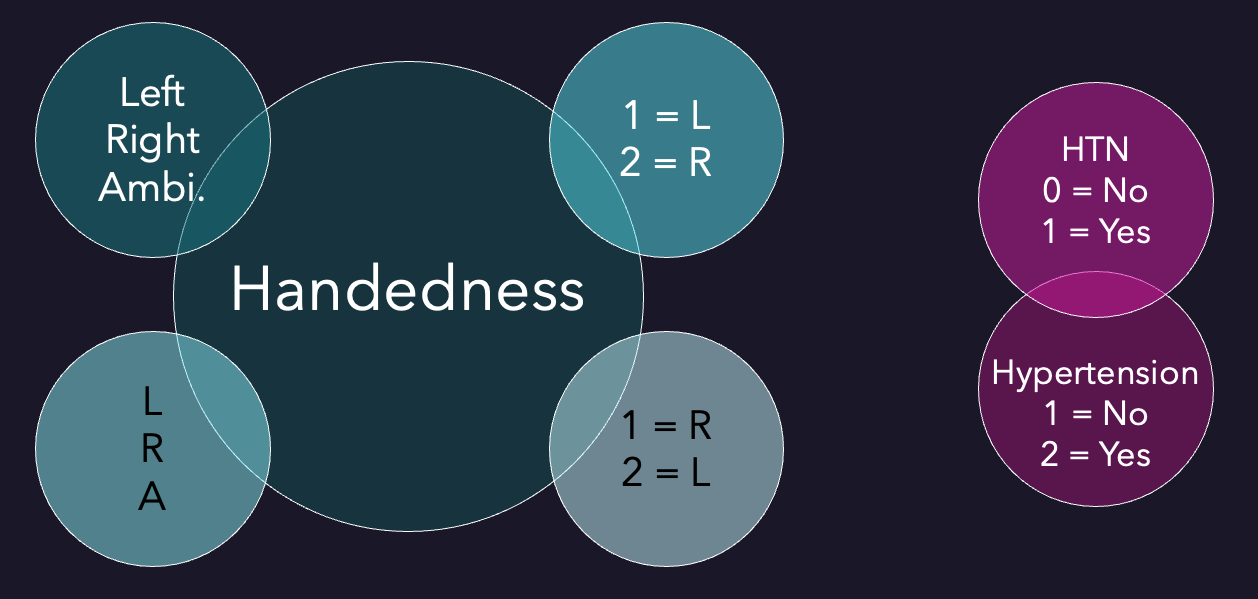 However, this presents an additional challenge, as research groups typically use different conventions and standards to collect and store otherwise similar data. For example, one laboratory might record its research participants' weight in pounds and another in kilograms, or encode people's handedness as Left/Right/Ambidextrous, L/R/A, or 1/2/3 (where 1 could mean Left in one dataset and Right in another), or refer to the same information with different names (e.g., HTN and Hypertension).
